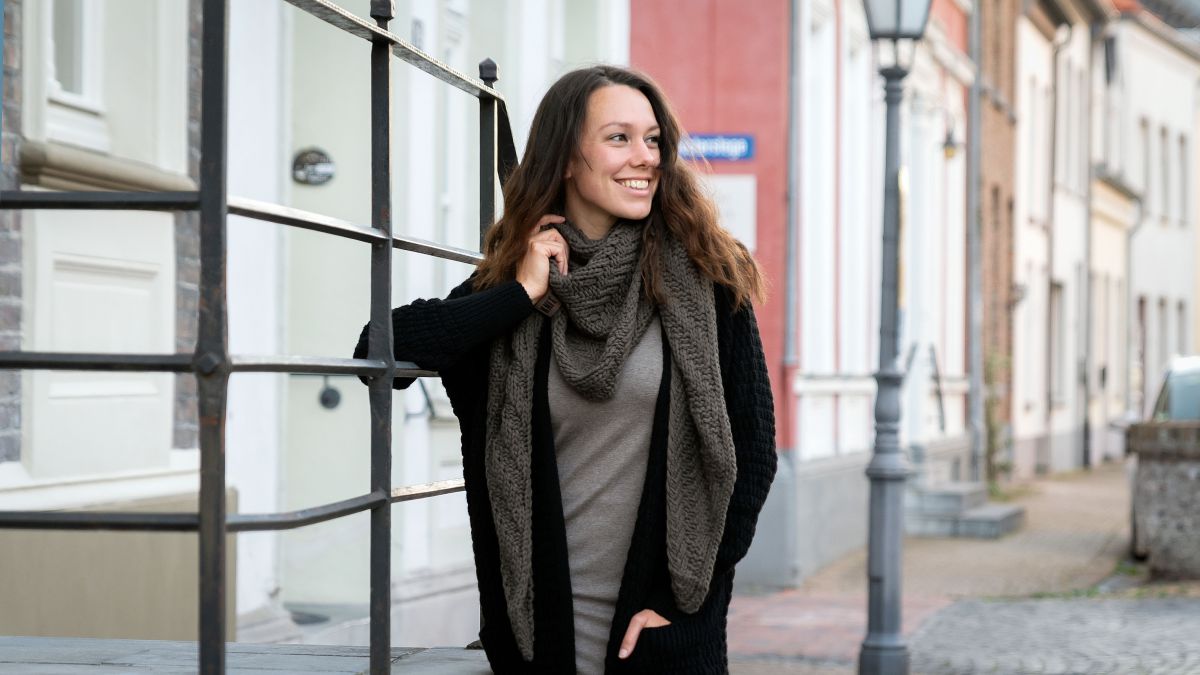 Der grob gestrickte Schal hat ein besonderes auffälliges Strickmuster