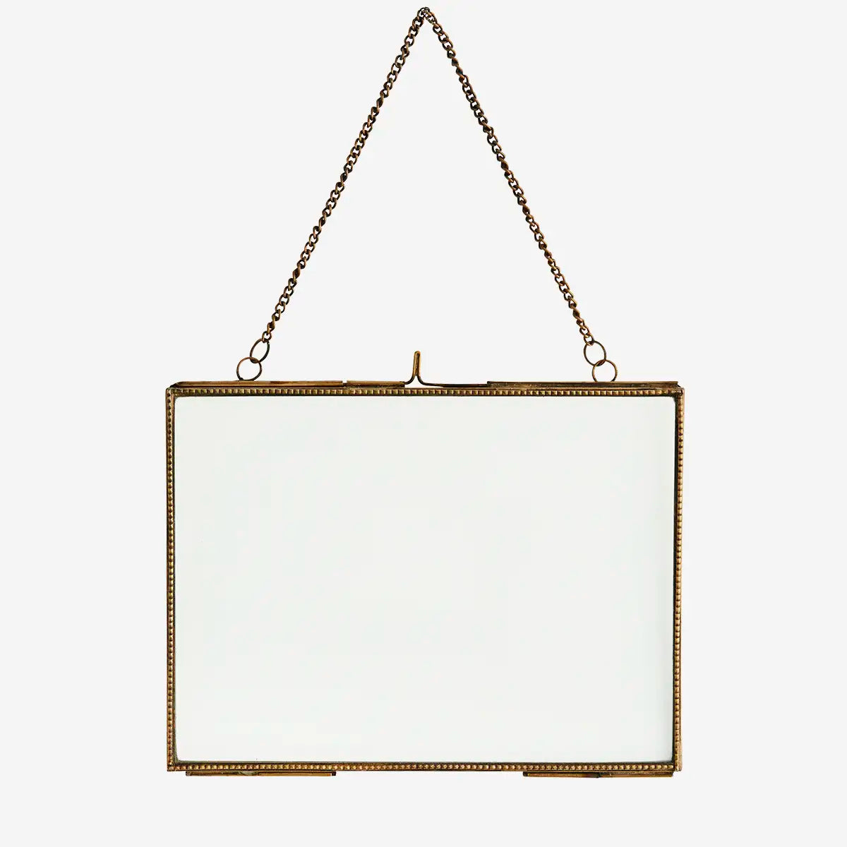 Der Fotorahmen mit Kette von Madam Stoltz bietet eine elegante Lösung zur Präsentation deiner Fotos. Mit einem Rand in Messing-Optik und beidseitigem Glas ermöglicht er eine ansprechende Sicht auf deine Bilder. Ideal für eine kreative und stilvolle Wohnraum- & Wandgestaltung.