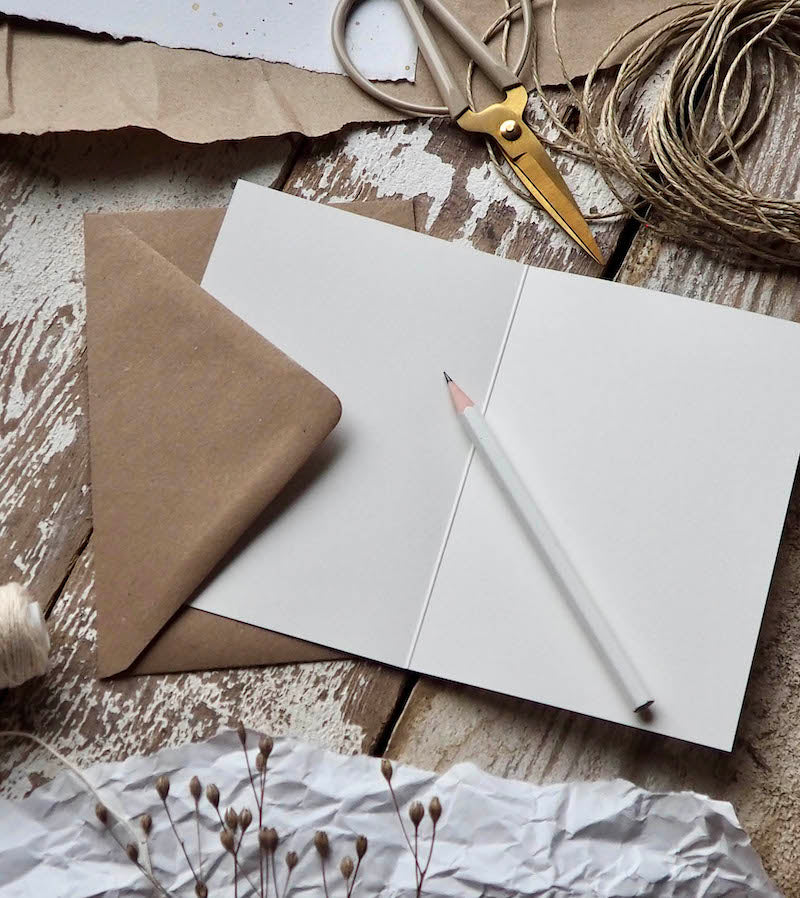 Sie wird mit einem passenden Umschlag aus braunem Recyclingpapier geliefert.
