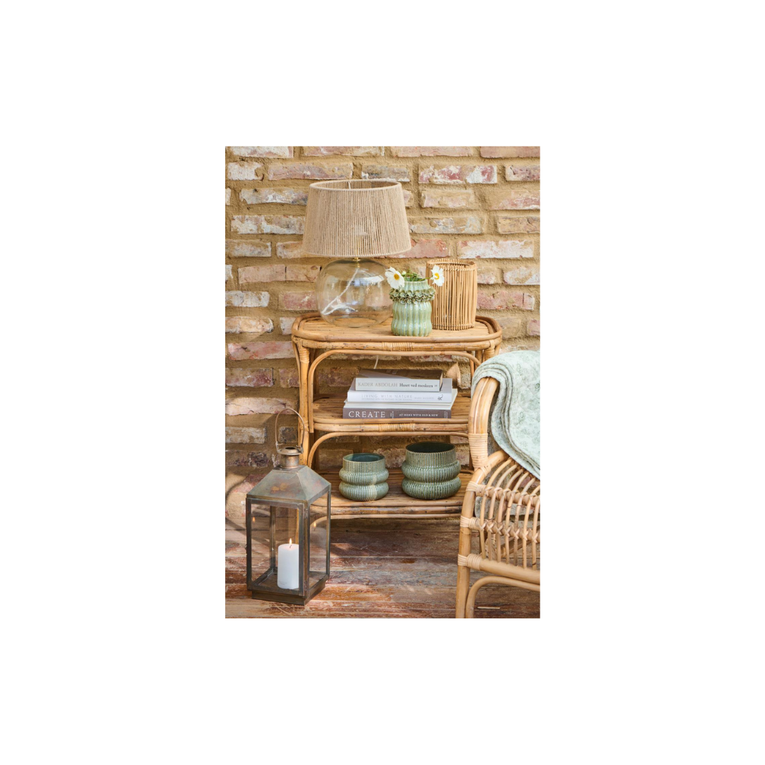 Eine mega tolle Tischlampe mit mundgeblasen Glasfuss und handgefertigten Lampenschirm aus natürlicher Jute. Die Lampe hat eine weisse Leitung (220 cm). Sie schafft einfach in jedem Raum eine gemütliche Atmosphäre