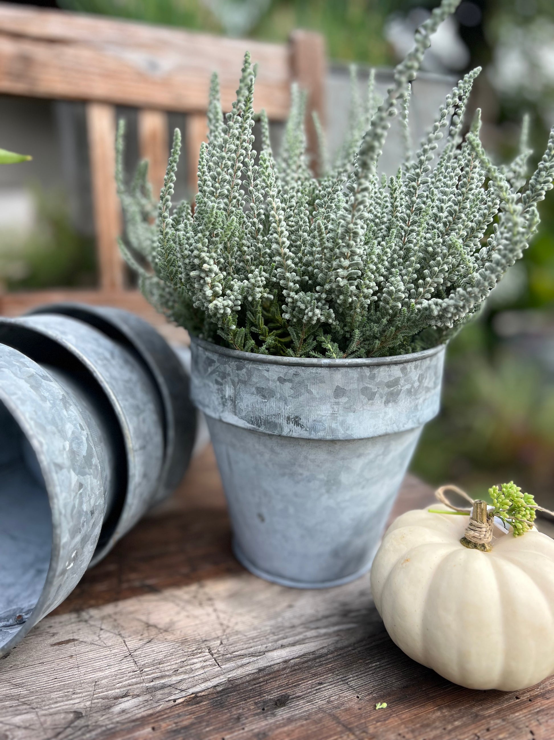 Der Zinkübertopf ist perfekt für eine herbstliche Bepflanzung geeignet. Sein Design sorgt für eine ansprechende Optik im Garten oder auf dem Balkon.